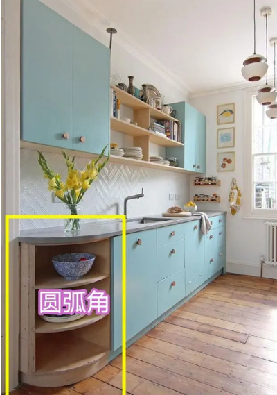 U型或L型廚房,避免不了轉(zhuǎn)角的空間,注意不要做尖角轉(zhuǎn)角,建議師傅打磨成圓角弧形,這樣視覺上看上去比較美觀,即使磕碰到,也不會有危險,安全得很。